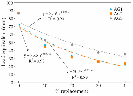 HVL and TVL are the thickness of shielding material required to attenuate the radiation by half and 90%, respectively. As can be seen in Table 5, the HVL and TVL are always inversely proportional to the linear attenuation coefficient. The 1 mm lead equivalent values also showed a similar trend. For example, if a proactive layer with a lead equivalent of 1 mm is required, 86.8 mm of a sample with 100% natural sand is needed. However, using a denser shielding aggregate can considerably reduce the materials to achieve the same effect. The thickness can be reduced by about 76.7%, 72.5%, and 59.3% when natural sand is replaced by 40% of AG1, 40% of AG2, and 40% of AG3, respectively. This improvement may be obtained from the heavy metal elements in AG1, AG2, and AG3, e.g., iron (Fe) [39,56].