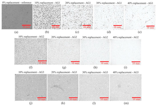 Figure 12 shows the radiographs from the X-ray test of materials produced from waste AG1 (Figure 12b–e), AG2 (Figure 12f–i), AG3 (Figure 12j–m), and the reference sample (Figure 12a).