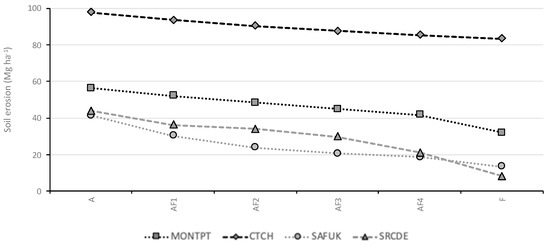 The lowest predicted levels of soil erosion, over 80 years, ranged from 85 Mg ha−1 at the Swiss site and 33 Mg ha−1 in Portugal to 13 Mg ha−1 and 8 Mg ha−1 at the British and German sites, respectively. The low rates at the British and German sites were partly the result of low rain erosivity (R) as rainfall tends to regularly be distributed through the year; at the Portuguese and the Swiss sites, much of the rainfall is concentrated into just a few months. The particularly high values at the Swiss case study site were then mostly as a result of the high soil erodibility (K) [48].