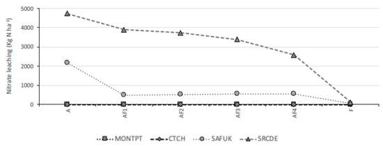 Related to the nitrate leaching, as the Portuguese montado and the Swiss cherry orchards do not present fertilization of the grasslands, nitrate leaching was considered negligible for these systems. For the English silvoarable and the German short rotation case studies, the forestry alternatives (SAFUK-F and SRCDE-F) are able to nearly eliminate any trace of nitrate leaching (99% and 98%, respectively). However, there is a difference between both systems related to the effect of the implementation of the first trees. In this sense, the AF1 alternative for the English case (SAFUK-AF1) is able to reduce 78% of the nitrate leaching while, in the German case, the reduction is only of 18%, reaching 46% for the most dense agroforestry alternative (SRCDE-AF4). Both values are within the range previously observed of between 40% and 70% [3,4,54] and up to 85% in greenhouse experiments [61].