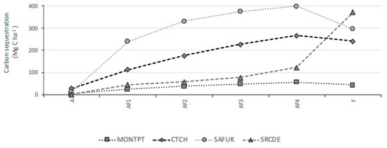 Considering each case study, for the 80 years of assessment of the montado system, the agroforestry and forestry alternatives ranged values of carbon sequestration in total of between 24 Mg C ha−1 (MONTPT-AF1) and 57 Mg C ha−1 (MONTPT-AF4). For the cherry orchards, the values ranged from 112 Mg C ha−1 (for the CTCH-AF1 alternative) to 267 Mg ha−1 (found for the CTCH-AF4 and CTCH-F alternatives). In the English silvoarable system, the presence of trees allows sequestering a positive amount of up to nearly 400 Mg C ha−1 in the most tree-dense agroforestry alternative (SAFUK-AF4) and a minimum of 240 Mg C ha−1 in the less dense (SAFUK-AF1, 56 trees ha−1). These systems have a net positive carbon sequestration compared to the “no trees” alternative that shows a loss of around 1 Mg C ha−1 (from an initial soil carbon of 21.5 Mg C ha−1 to a final carbon sequestration of 20.5 Mg C ha−1). Related to the German site, only the presence of trees ensures a positive net carbon sequestration with a minimum of 46 Mg C ha−1 in the less dense agroforestry alternative (96 m wide lines, SRCDE-AF1) up to 122 Mg C ha−1 for the most dense agroforestry alternative (SRCDE-AF4), with the pure SRC alternative (SRCDE-F) tripling this value (373 Mg C ha−1).