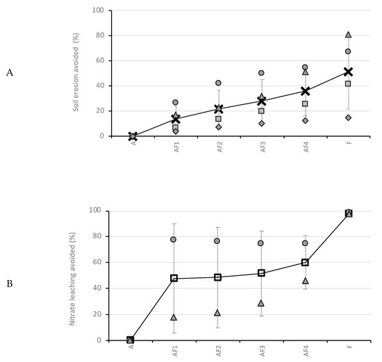 Comparing the tree-present alternatives to the arable alternative and considering the average decrease in soil erosion avoided, results show that the initial trees are able to avoid more soil erosion compared to the additional ones (Figure 4A). In this sense, the increase in tree density from A to AF1 represents an average decrease of 14% of the soil erosion while the following increases in tree density (AF2, AF3 and AF4) just represent a decrease of 7.7%, 6.5% and 8.1% of soil eroded, respectively.