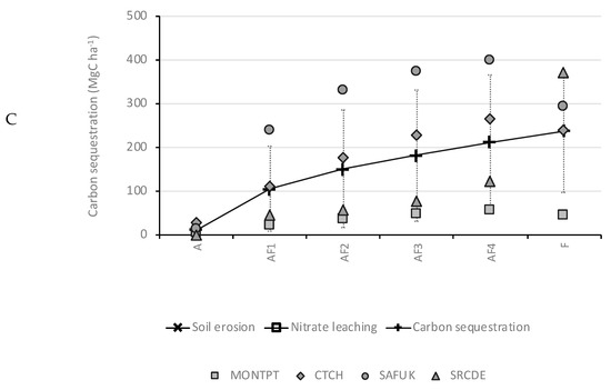 Average percentage of reduction of soil loss (A), average percentage of reduction of nitrate leaching (B) and average percentage of increase in carbon sequestration (C) for six different management alternatives in increasing tree densities across Europe: for the montado systems in Portugal (MONTPT), the cherry orchards in Switzerland (CTCH), the silvoarable systems in the UK (SAFUK) and the short rotation coppice in Germany (SRCDE). MONTPT: 0 trees ha−1 (A), 50 trees ha−1 (AF1), 100 trees ha−1 (AF2), 150 trees ha−1 (AF3), 200 trees ha−1 (AF4) and forestry (F). CTCH: 0 trees ha−1 (A), 26 trees ha−1 (AF1), 52 trees ha−1 (AF2), 78 trees ha−1 (AF3), 104 trees ha−1 (AF4) and forestry (F). SAFUK: 0 trees ha−1 (A), 56 trees ha−1 (AF1), 78 trees ha−1 (AF2), 117 trees ha−1 (AF3), 156 trees ha−1 (AF4) and forestry (F). SRCDE: 0 trees ha−1 (A), alley widths of 96 m (AF1), 72 m (AF2), 48 m (AF3), 24 m (AF4) and pure SRC (F).