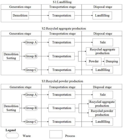 In this study, waste was classified into three categories: (A) Metal, timber, plastic, and glass; (B) cement, concrete, bricks, and tiles; and (C) mixed fragments. Metal, timber, and plastic are all for sale. However, in practice, the demolition waste from most old urban areas primarily consists of brick and concrete, with few other materials. Some owners feel that the sorting cost is too high and send the unsorted waste to landfills for convenience. To make this study more complete and comprehensive, and to compare it with other scenarios, this study also analyzed the landfilling of group A wastes. Group B wastes were the focus of this study, and landfilling and recycling processes were analyzed. Recycled wastes can be classified into two types depending on the processing methods: Recycled aggregate and recycled powder. However, not all wastes in group B can be processed into recycled powder; therefore, most of them were processed into recycled aggregate. Wastes in group C cannot be recycled and can only be landfilled. According to different disposal methods, this study analyzed three different scenarios: (S1) Landfilling, (S2) recycled aggregate production, and (S3) recycled powder production (see Figure 1).