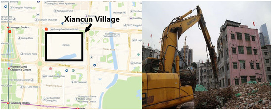 For the case study, a reconstruction project in an old urban area of Guangzhou, Guangdong province, China (Figure 3) was selected. The project is located in Xiancun, southwest of Tianhe district, Guangzhou (23°12′ N and 113°32′ E). The total land area of Xiancun is 18.49 ha. Most buildings were multi-story buildings. The area had high building density and small building spaces. The total building area was 720,000 m2, and a total of 1,258,324.36 t of waste was generated from demolition. The specific components of the demolition waste were determined by a local on-site survey in Xiancun (see Table A2, Appendix B).