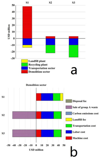 As shown in Figure 5b, the total cost of the demolition sector in S1 was USD 48.216 million, with the labor costs (USD 21.306 million) being the highest, followed by the transportation costs (USD 12.857 million). The expenses resulting from S2 and S3 were the same as the income. Owing to the huge income generated by the sale of group A wastes, the total cost (USD 3.171 million) was greatly reduced compared to that of S1. Although recycling group A wastes generates income, it also causes an increase in labor, machine, and carbon emission costs; however, the increase is not notable. Moreover, since group A and B wastes were no longer landfilled, the landfill fees for S2 and S3 (USD 0.071 million) were also greatly reduced. It is worth noting that the carbon emission cost in S1 was positive (USD 0.044 million), but those in S2 and S3 were negative (USD −0.963 million), indicating that the carbon emission reduction caused by the recycling of group A waste has economic benefits.