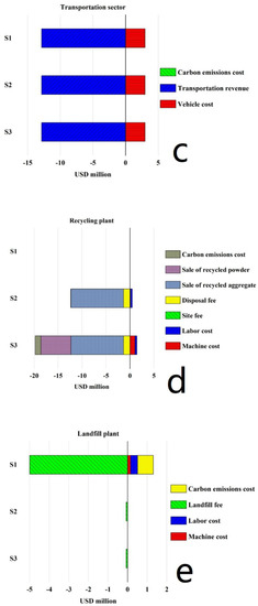 The economic results of the recycling plant are shown in Figure 5d. There was no use of the recycling plant in S1; hence, the revenue and expenditures were both zero. In S2, the total cost of the recycling plant was USD −11.888 million, indicating that the production of recycled aggregate can increase the profit for the recycling plant. The expenditures of the recycling plant in S2 were primarily the labor costs (USD 0.362 million). The lowest cost was the site fee (USD 0.011 million), and the machine cost (USD 0.105 million) was slightly higher than the site fee. The revenue from the sale of the recycled aggregate (USD 10.970 million) was the main income source for the recycling plant in S2. Although the revenue generated by carbon emission reduction was small (USD 0.051 million), it shows that the carbon emission reduction resulting from processing group B waste into recycled aggregate can bring economic benefits. Compared to S2, the recycled powder was produced in the recycling plant in S3; thus, the corresponding machine (USD 1.039 million) and labor costs (USD 0.384 million) were higher than those for S2. Although the machine and labor costs increased, the sale of recycled powder generated considerable economic benefits (USD 6.291 million). At the same time, the replacement of raw materials with recycled powder reduced large amounts of carbon emissions, with an economic benefit of USD 1.193 million, making the total cost of S3 (USD 18.365 million) lower than S2.
