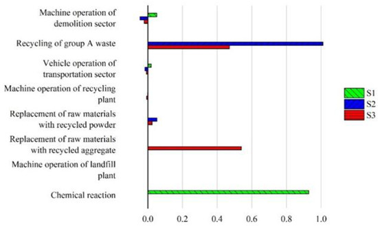 In S1, a chemical reaction change of 20% caused an 18.55% change in the final result. In S2, the recycling of group A waste (±20.21%) had the greatest impact on the final result. The final result in S3 was the most sensitive to the replacement of raw materials with recycled powder (±10.79%). The machine operation from the demolition sector, vehicle operation from the transportation sector, machine operation at the landfill plant, and chemical reactions all had varying degrees of impact on the three scenarios.