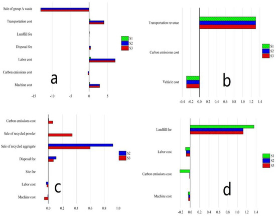 Based on the LCC analysis of the three scenarios, this study conducted an economic sensitivity analysis for each sector. In each scenario, every relevant variable was individually changed by ±20% to determine the change in the final result (sector total cost). We divided the variation of the result by the variation of the variable to obtain the corresponding sensitivity ratio. As shown in Figure 7a, the total cost of the demolition sector in S1 was not sensitive to any of the variables; the labor costs (0.4419) had the greatest impact on the result, while the cost of carbon emissions (0.0009) had the least impact. The cost of the demolition sector in S2 was the same as that in S3; thus, the sensitivity ratio was the same. The sale of group A waste (−13.1407) had the greatest impact on the result, while the carbon emissions cost (0.0225) had the least impact.