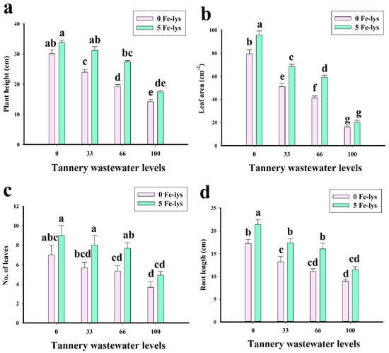 Effect of different levels of tannery wastewater on plant height (a), leaf area (b), number of leaves (c) and root length (d) under the application of iron-lysine to S. oleracea plants. Values are demonstrated as means of three replicates along with standard deviation (SD; n = 3). One-way ANOVA was performed, and mean differences were tested by highest significant deviation (HSD) (p < 0.05). Different lowercase letters on the error bars indicate a significant difference between the treatments. Relative radiance of plastic filter used: 0 (without irrigation with wastewater), 33 (33% irrigation with wastewater), 66 (66% irrigation with wastewater) and 100 (100% irrigation with wastewater).