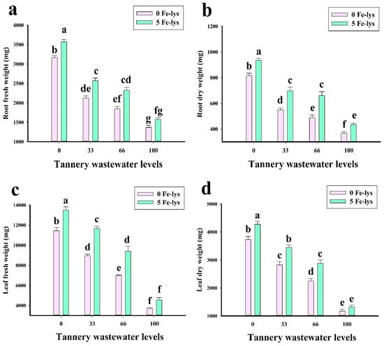 Recently, various techniques and methodologies have been developed to reduce the heavy metal stress in plants [,,,]. In the past few years, a new method has been adopted to emphasize the use of amino acids as chelates to reduce toxic heavy metals [,,]. Souri [] has previously investigated the role of iron (Fe) chelated fertilizer with the amino acid lysine in improving crop growth and yield. Because Fe is an essential micronutrient for proper plant growth and development, it plays a crucial role in plant metabolism in enzymatic and metabolic processes [,,]. Conversely, Fe deficiency significantly alters the morpho-physiological characteristics of plants and results in stunned plant growth and biomass []. Nevertheless, the application of Fe complex with lysine (lys) greatly reduces the toxicity induced by heavy metals stress. Fe complex with lys significantly reduced the Cd stress by improving rice growth, photosynthesis and the antioxidant system []. Large amounts of heavy metals in plant organs seriously affected the quality of their vegetative characters. In order to overcome this drawback, the current study examined the exogenous impact of Fe-lys on plant growth and biomass by decreasing the consumption of Cr in plant organs grown in soil irrigated with wastewater tanning.
