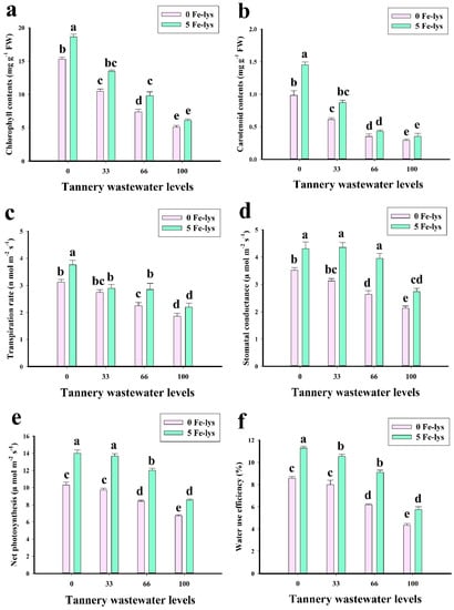 Photosynthetic pigments, along with different gaseous exchange parameters, were significantly decreased in S. oleracea plants when growing in soil having a large amount of tannery wastewater. The increasing level of tannery wastewater (33, 66 and 100%) in soil reduced the photosynthetic pigments and gaseous exchange parameters of S. oleracea plants when compared to control treatment. The data regarding these parameters are presented in Figure 3. Figure 3 shows that the maximum contents of chl, carot, Tr, Gs, Pn and Wi in the plants grown under 100% addition of tannery wastewater in the soil decreased (significantly, p < 0.05) by 43.1, 28.4, 35.7, 30.1, 71.1 and 41.8%, respectively, compared to the control treatment. Although the exogenous supplementation of Fe-lys increased (significantly, p < 0.05) chl, carot, Tr, Gs, Pn and Wi by 16.4, 22.5, 4.5, 34.5, 6.9 and 89.0%, respectively, in the plants grown under 100% addition of tannery wastewater in the soil without supplementation of Fe-lys, compared to the plants grown under 100% addition of tannery wastewater in the soil with the supplementation of Fe-lys. Moreover, it was also noticed that the application of Fe-lys also increased the photosynthetic pigments and gaseous exchange parameters without the addition of different levels of tannery wastewater in the soil.