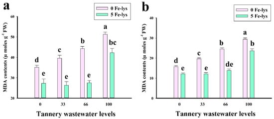 High levels of heavy metals in arable land, due to the existence of industrial effluents and industrial waste, pose a serious ecological threat to plants having various important antioxidants [,,,,]. The addition of wastewater seriously affects plant growth and biomass [,], due to the toxic effects of heavy metals in the soil [,,]. In the current study, increasing levels of wastewater (33, 66 and 100%) in soil displayed inhibitory effects on all morphological traits of the S. oleracea plants, by declining different parameters of plant growth and biomass when compared to the control treatment (Figure 2 and Figure 3). We also elucidated that the application of Fe-lys increased plant growth and biomass even in the toxic levels of Cr in soil (Figure 2 and Figure 3). Several studies showed that the addition of wastewater in the soil directly influenced the plants’ composition and caused their significant reduction (p < 0.05) [,]. This is because Cr is the most toxic heavy metal, causes a delay in seed germination [] and ultimately decreases plant growth and biomass [,,]. However, the application of Fe-lys ameliorates Cr toxicity in the S. oleracea plants by Fe fortification. A similar trend was recorded by Bashir et al. [], who studied Oryza sative growth under toxic levels of Cd and reported that the foliar spray of Fe-lys ameliorates Cd toxicity by decreasing its contents and increasing plant growth and biomass, compared to plants grown in the absence of Fe-lys. In the present study, we also noticed that the application of Fe-lys increased plant growth and biomass in the plants which are not grown in the tannery wastewater soil (Figure 2 and Figure 3). This is because Fe-lys enhances protein properties (metabolic function and stock of amino acid function in plants), increases the photosynthetic processes for creating a healthy plant and provides a substantial growth in a short time in the stress condition or even in the plants grown in a normal soil [].