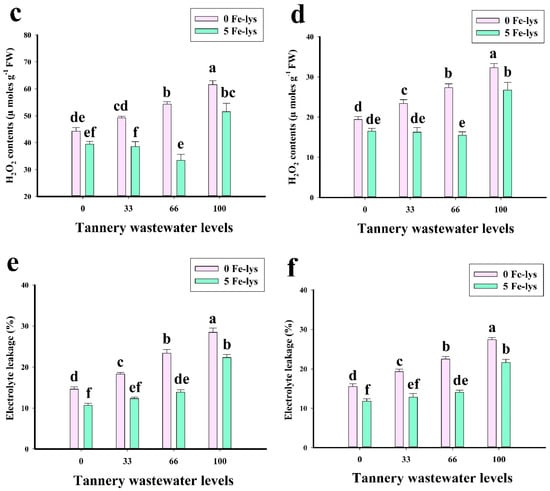 Effect of different levels of tannery wastewater on MDA contents in the roots (a), MDA contents in the leaves (b), H2O2 contents in the roots (c), H2O2 contents in the leaves (d), EL percentage in the roots (e) and EL percentage in the leaves (f) under the application of iron-lysine to S. oleracea plants. Values are demonstrated as means of three replicates along with standard deviation (SD; n = 3). One-way ANOVA was performed, and mean differences were tested by HSD (p < 0.05). Different lowercase letters on the error bars indicate significant difference between the treatments. Relative radiance of plastic filter used: 0 (without irrigation with wastewater), 33 (33% irrigation with wastewater), 66 (66% irrigation with wastewater) and 100 (100% irrigation with wastewater).