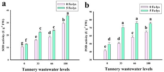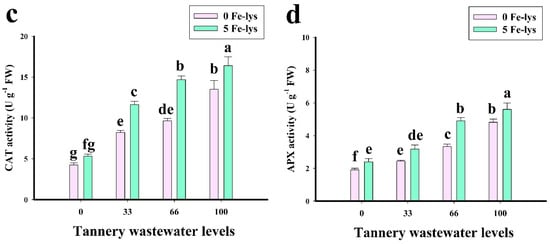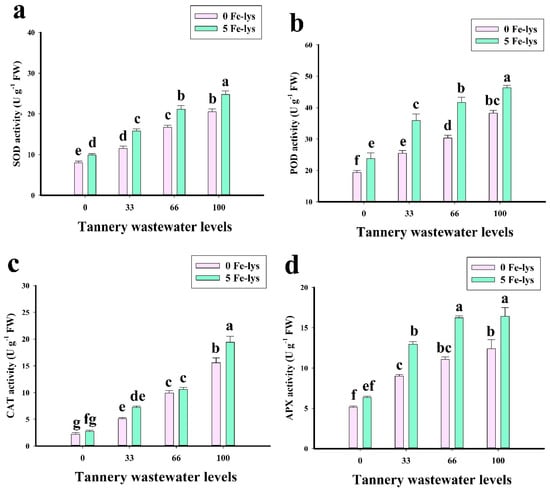 The increased contents of MDA, H2O2 and EL (%) indicate that the high contents of metal in the soil used caused oxidative damage in S. oleracea plants. Similarly, the activities of various antioxidative enzymes also increased with the addition of tannery wastewater in the soil, when compared to the control treatment. The data regarding oxidative stress and antioxidant response in the roots and leaves of S. oleracea plants are presented in Figure 4, Figure 5 and Figure 6, respectively. Compared to the control treatment, maximum contents of MDA, H2O2 initiation and EL (%) were shown in the plants grown in 100% addition of tannery wastewater in the soil, which increased 3.9, 1.8 and 3.6 times, respectively, in the roots and 2.6, 3.4 and 3.2 times, respectively, in the leaves. However, the exogenous application of Fe-lys decreased the contents of MDA, H2O2 initiation and EL (%) in the roots as well as in the leaves of S. oleracea plants. Similarly, the activities of antioxidants increased with the increase of tannery wastewater in the soil. Compared to the plants grown in the control treatment, the maximum activities of SOD, POD, CAT and APX increased (significantly, p < 0.05) by 18.9, 21.6, 29.3 and 36.4%, respectively, in the roots and 28.0, 21.6, 35.6 and 25.2%, respectively, in the leaves of the plants grown in 100% addition of tannery wastewater without the application of Fe-lys. Compared with the plants grown in wastewater treatments, the application of Fe-lys further enhanced the activities of antioxidants in the roots as well as in the leaves or even in the plants grown without the addition of tannery wastewater in the soil (Figure 5 and Figure 6).