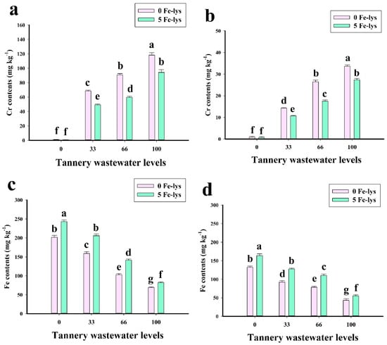 In the current study, the increasing levels of wastewater (33, 66 and 100%) in the soil increased Cr contents and decreased Fe contents in all organs of S. oleracea plants (Figure 7). However, the exogenous supplementation of Fe-lys decreased Cr contents and increased the essential micronutrient (Fe) in all organs of S. oleracea plants (Figure 7). In many previous studies, it was also observed that the increasing levels of Cr in the soil caused a significant (p < 0.05) increase in Cr contents in all organs of the plants [,,,]. The decrease in essential nutrients such as Fe might be linked with the decrease in the nutrient uptake by the plants, which might be due to excess contents of Cr in the soil [,,,]. It is also well documented that Cr is extremely toxic for plants and disturbs metabolic processes, which ultimately decreases the quantity of essential nutrients in plant organs and thus affects plant growth and yield [,,]. Previously, Zaheer et al. [] also reported the same trend, showing that various levels of Cr in the soil also enhance Cr contents in different plant parts and reduce essential nutrients due to excess contents of Cr in plant tissues. However, the availability and toxicity of Cr can be overcome by the exogenous application of micronutrients chelated with amino acids [,]. The present study also demonstrated that the exogenous supplementation of Fe-lys decreased Cr contents and increased Fe contents in various parts of S. oleracea plants, compared to plants grown in the absence of Fe-lys (Figure 7). The reduced Cr concentration in all organs of S. oleracea plants might be due to the higher Fe contents in the plants, as Cr and Fe showed antagonistic effects reported previously by Danish et al. []. However, the reduction in Cr contents might also be due to the increase in Fe contents in different organs of the plants (Figure 7). Moreover, under flooded conditions, Fe2+ is the main form of Fe in the soil, which may compete with Cr at the root surface during plant uptake []. Bashir et al. [] reported that foliar spray of Fe-lys increased the Fe contents and decreased the heavy metal (Cd) contents in all parts of rice (Oryza sative) plants, compared to plants grown in the absence of Fe-lys. It was also reported that both Fe and Cr compete in an environment with an excess of Cr, while the external application of Fe-lys helps the plants to uptake large amounts of Fe and decrease the uptake of Cr by the plant organs []. Taken together, the application of Fe-lys helps the plants to maintain their growth and composition and also promotes the uptake of Fe contents and decrease Cr contents in plants grown in an environment with an excess of Cr.