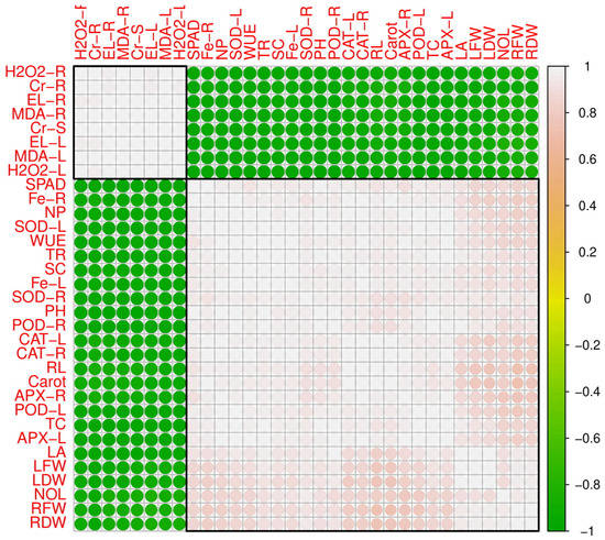 Correlation between different growth and physiological attributes with Cr uptake and accumulation in S. oleraceas plants. H2O2-R (H2O2 initiation in roots), CR-R (Cr contents in roots), EL-R (electrolyte leakage in roots), MDA-R (MDA contents in roots), CR-S (Cr contents in shoots), EL-L (electrolyte leakage in leaves), MDA-L (MDA contents in leaves), H2O2-L (H2O2 initiation in leaves), SPAD (SPAD values), Fe-R (iron contents in roots), NP (net photosynthesis), SOD-L (SOD activity in leaves), WUE (water use efficiency), TR (transpiration rate), SC (stomatal conductance), Fe-L (iron contents in leaves), SOD-R (SOD activity in roots), PH (plant height), POD-R (POD activity in roots), CAT-L (CAT activity in leaves), CAT-R (CAT activity in roots), RL (root length), Carot (carotenoid contents), APX-R (APX activity in roots), POD-L (POD activity in leaves), TC (total chlorophyll contents), APX-L (APX activity in leaves), LA (leaf area), LFW (leaves fresh weight), LDW (leaves dry weight), NOL (number of leaves), RFW (root fresh weight), RDW (root dry weight).