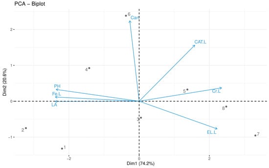 Score and loading plots of principal component analysis (PCA) on different studied attributes of S. oleracea plants grown in tannery wastewater soil. Score plot represents the separation of treatments: (1) Cr 0%, Fe-lys 0 mg L−1 (2) Cr 0%, Fe-lys 10 mg L−1 (3) Cr 33%, Fe-lys 0 mg L−1 (4) Cr 33%, Fe -lys 10 mg L−1 (5) Cr 66%, Fe-lys 0 mg L−1 (6) Cr 66%, Fe -lys 10 mg L−1 (7) Cr 100%, Fe-lys 0 mg L−1 (8) Cr 100%, Fe -lys 10 mg L−1. The abbreviations are as follows: PH (plant height), Fe-L (Fe contents in the shoots), LA (leaf area), carot (carotenoid contents), CAT.L (CAT activity in the leaves), CR.L (Cr contents in leaves) and EL.L (electrolyte leakage in the leaves).
