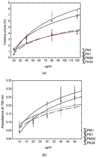 Chelating activity (a) and reducing power (b) of bread with extract of the leaves and mulberry fruit. PM1—bread with addition of mulberry analyzed on the day of baking; PM30 - bread with addition of mulberry analyzed after 30 days of freezing storage; PK1—control bread without mulberry analyzed on the day of baking; PK30 - control bread without mulberry analyzed after 30 days of freezing storage