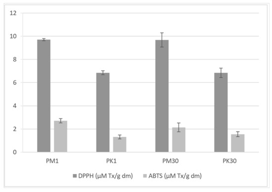 Antiradical activity measured by test with DPPH· and ABTS·+ radicals of bread with extract of the Morus alba leaves and mulberry fruit before and after storage. PM1—bread with addition of mulberry analyzed on the day of baking; PM30—bread with addition of mulberry analyzed after 30 days of freezing storage; PK1—control bread without mulberry analyzed on the day of baking; PK30—control bread without mulberry analyzed after 30 days of freezing storage.