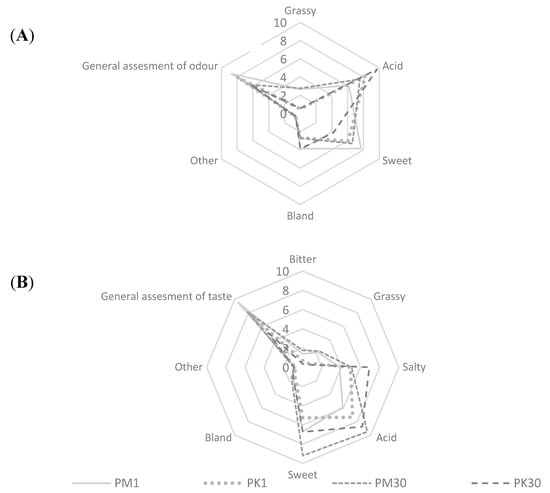 In terms of the taste of the samples, significant differences were found in the sensation of all the descriptors studied, except for insipid and foreign taste, which were evaluated at a low level, not differing from each other, ranging from 0.69 to 1.35. It was shown that the addition of mulberry to bread significantly increased the feeling of bitter, grassy and sweet taste. On the other hand, the dominant taste in the control bread was sour and salty. As a result of the analysis, a statistically higher evaluation of the overall taste desirability was found for bread with mulberry. It was shown that the sensory profile of the tested samples of mulberry bread changed as a result of the storage. In order to illustrate the evaluation of the extent to which each of the variables is represented by the current set of factors, the results are presented in Figure 4. The further away a given variable is from the center of the circle, the better it is represented by the current coordinate system. The change of smell in the stored samples was not correlated with all relevant taste characteristics. During the storage of the bread, a decrease in the sweet smell and an increase in the grassy smell were observed, while in terms of taste, an increase in the sweet taste and a decrease in the grassy smell were observed. There was also a correlation between the smell and taste and an increase in the sour taste of the product after the storage.