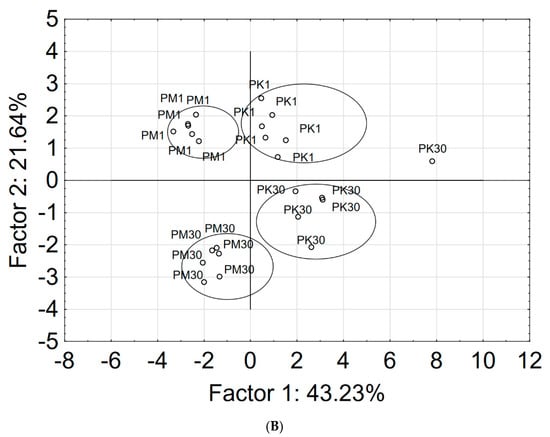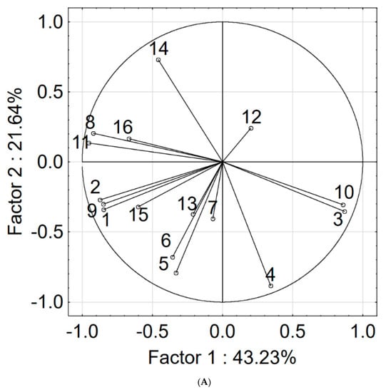 Principal component analysis (PCA) on the correlation matrix for quality indexes in profile analysis of bread with addition of Morus alba fruits and leaves extracts (A) for tested samples and principal components projection (B). Legend: 1—Bitter (taste); 2—Grassy (taste); 3—Salty (taste); 4—Acid (taste); 5—Sweet (taste); 6—Bland (taste); 7—Other (taste); 8—General assessment of taste; 9—Grassy (odor); 10—Acid (odor); 11—Sweet (odor); 12—Bland (odor); 13—Other (odor); 14—General assessment of odor (odor).