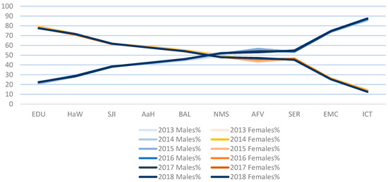 Various research concludes that technology and computers have historically been considered to be pre-eminently male tools [16,17,18,19,20]. Likewise, in their leisure, women and girls use video games less, despite their influence on the use of technology [17,21,22,23,24,25,26]. It is reasonably appreciated that the digital gender gap can be connected to the meager matriculation of women in technological studies. If we focus on Spain and the allotment of undergraduates in tertiary education by area of study and gender, it can be perceived that women choose mostly careers related to education, health, and the services sector. However, men are guided by technical, engineering, and computer careers where women barely reach 10% (Table 1 and Figure 1) [27].