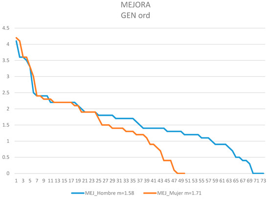Trend chart of the amelioration variable MEJ over the gender variable GEN (results ordered from highest to lowest).