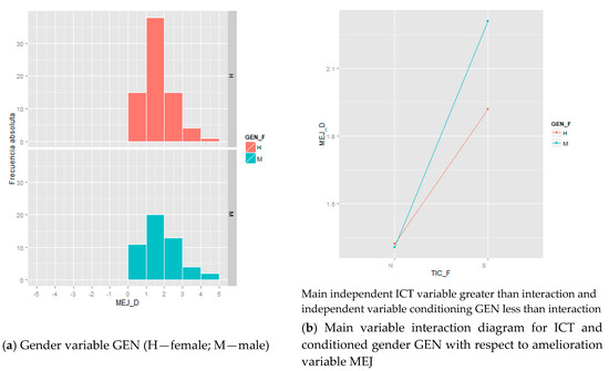 Histograms and interaction diagram of the amelioration variable MEJ over the gender variable GEN.