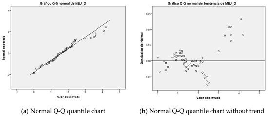 The inferential statistical techniques used included the Kolmogorov–Smirnov normality proof, with the Lilliefors correction, to guarantee the normality prerequisite in the application of parametric techniques. The Levene proof was additionally employed to confirm the homoscedasticity in the contrast of the variances. The normalization can be seen in the Q-Q charts in Figure 5, as the points in the normal Q-Q diagram conform to the diagonal and the points of the normal Q-Q diagram without trend are randomly distributed without showing a clear pattern.