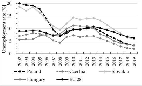 Unemployment rate in the Visegrad Group and European Union (EU) 28 countries in the years 2002–2019. Source: Authors’ elaboration, based on the Eurostat data.