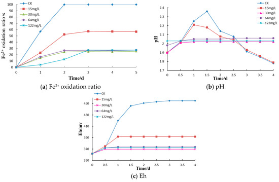 The pH and oxidation–reduction potential (Eh) can also reflect the oxidation of Fe2+. As seen in Figure 1b, when the concentration of Kathon was below 30 mg/L, the pH of bacterial solution first increased (within 0–36 h) and then decreased. The reason is that a large amount of acid was consumed during Fe2+ oxidation, which increased the pH of the bacterial solution significantly. Subsequently, greater amounts of Fe3+ were oxidized, and the jarosite formed after hydrolysis caused the pH of the bacterial solution to drop rapidly. In addition, the time course of Eh (Figure 1c) followed the course of Fe2+ oxidation in Figure 1a. In Kathon treatments with concentration >30 mg/L, no changes in pH or Eh were observed, indicating that 30 mg/L of the bactericide effectively inhibits the oxidation of Fe2+.
