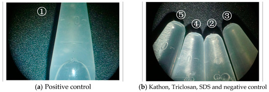 In Figure 2, No. 1 is a positive control sample, in which the bacteria were disrupted using a bead mill oscillator. The resulting complete release of proteins from the cells formed a milky flocculation precipitate. On the other hand, no flocculation precipitates were observed in a negative control (No. 5; a culture without any disruptions or bactericide additions). No. 2 was a bacterial solution treated with Kathon. The flocculation precipitate formed in this sample was greater than in No. 3 treated with Triclosan that showed no flocculation precipitate. The comparison indicates that Kathon causes protein efflux from AF-14 cells, while Triclosan does not. The protein flocculation precipitate in No. 4 with SDS was slightly greater than that in No. 2, suggesting that SDS had an even stronger effect on protein efflux than Kathon.