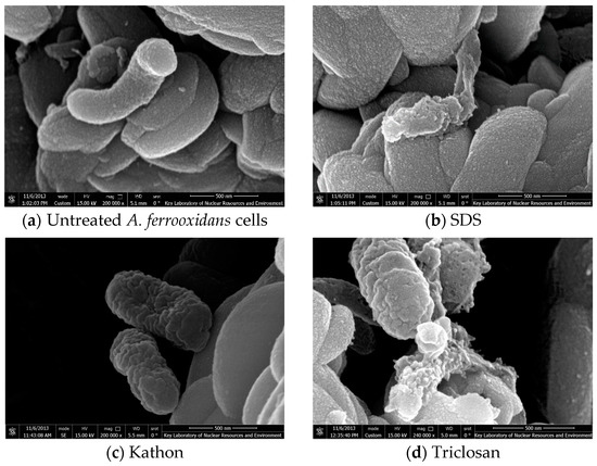 As shown in Figure 3b, 3 h after SDS was added, the cells were damaged and shrunken. The cell shape was distorted, with the presence of a viscous material on the surface. Consistent with Siebert et al., these findings demonstrated that SDS causes cell lysis, releasing nucleic acids [21]. This indicated that SDS destroyed the bacteria surfaces, inhibiting A. ferrooxidans activities.