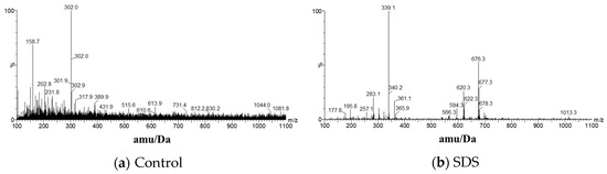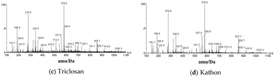 There was almost no lipid efflux in the blank control (Figure 4a). When treated with SDS, the cell lipids were released at high volumes (Figure 4b). The time-of-flight mass spectrometry for the solution treated with Triclosan (Figure 4c) also showed a peak between 600 Da and 900 Da, which indicated that some lipids could be secreted and that the internal structure of the bacteria was compromised. In contrast, the peak value between 600 Da and 900 Da for the Kathon treatment was lower and indicated a milder effect on lipids (Figure 4d).