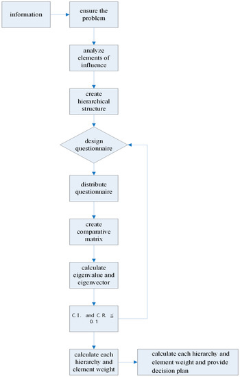 (1) The analytic hierarchy process (AHP) was developed by a University of Pittsburgh professor Thomas L. Saaty in 1971 for the United States Department of Defense to conduct response plan problem research. Specifically, the AHP is used in situations with uncertainty and decision-making problems with multiple evaluation criteria. In 1972, research on rational distribution of electric power in each industry was conducted under the sponsorship of the National Science Foundation [18]. Saaty started to create scales for AHP-related judgments when he was investigating the effect of “no peace and no war” on Egyptian economic, political, and military situations for the Egyptian government in July 1972. The AHP theory gradually matured when Saaty applied it to transportation research for Sudan in 1973. The theory became more comprehensive and complete after repeated applications, modifications, and verifications from 1974 to 1978. In 1980, Saaty organized the AHP theory into a book. Subsequently, the theory has been applied in various domains such as business, engineering, and public policy [19].