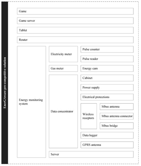Two product systems were analysed: the EnerGAware pre-competitive solution and the EnerGAware market solution. The EnerGAware pre-competitive solution directly arises from the research project [15] and includes the game “Energy Cat: the House of Tomorrow” [16], the game server, the tablet provided to the tenants on which to run the game, the router, and the energy monitoring system installed in the pilot houses (Figure 4). Electricity consumption data were collected by attaching an optical pulse reader and a standard wireless M-Bus pulse counter to the existing electricity meter. Gas meter consumption data were gathered using an energy cam to read existing meter data and transform it into an M-Bus parameter. A data concentrator wirelessly read the electricity and gas consumption data and sent them to a remote server through a GPRS connection. The data concentrator cabinet, installed inside the pilot study houses, included a 24 V DC (60 W) power supply to feed the whole set, general electrical protection according to current UK safety regulations for electrical equipment, and wireless receptors to collect data from the wireless M-Bus readers attached to the gas and electricity meters. The data concentrator cabinet also included a data logger that can read and store the meter data and receive remote server requests, and a GPRS antenna to easily connect to the wireless network without coverage problems. Finally, a remote data server hosted a platform to facilitate configuration, maintenance, and monitoring tasks for the energy monitoring system. The server also parsed messages and displayed data through web services for further analysis. For the purpose of this life cycle assessment (LCA) study and according to the initial design of the pilot experiment, it was assumed that the game was played in 50 homes for one year, although after this period, tenants could still save energy.