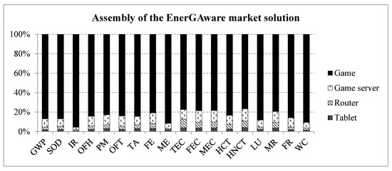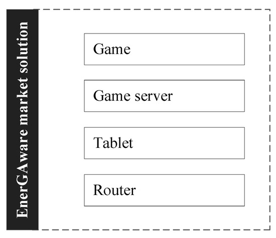 The EnerGAware market solution considers the exploitation of the developed solution. In this case, the analysed system includes the game “Energy Cat: the House of Tomorrow” [5], the game server and the part of the tablet and router needed to play the game (Figure 5). In this scenario, the game is distributed freely by energy providers to their customers. In this case, players use their own mobile devices and energy metering data is collected from existing smart meters. According to Berg Insight [30], almost 40% of the 281 million electricity customers in Europe (EU28 + 2) had a smart meter by the end of 2017, and this percentage is set to increase to 70% in the next 5 years. It is therefore reasonable to assume that in this case, a dedicated energy metering system will not be needed as the game will be connected to existing smart meters. For the purpose of this LCA study and for ease of comparison and analysis, this scenario also considered 50 users and one year of useful life.
