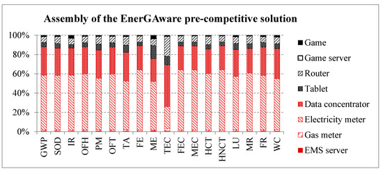 Table 2 and Figure 6 show environmental impacts caused by manufacturing the various EnerGAware pre-competitive scenario components. The results revealed that the environmental impact related to the assembly phase of the EnerGAware pre-competitive scenario was mainly caused by the energy monitoring system (represented in red in Figure 6) with contributions ranging from 82.30% to 89.05% in the impact categories, except for terrestrial ecotoxicity (69.20%) and marine eutrophication (75.92%). According to the results, the impact of the monitoring subsystem can be mostly attributed to the electricity meters (representing between 61.20% and 70.48% of the impact of the energy monitoring system), followed by the data concentrators, which contribute between 27.81% and 36.30%. The impact of the game subsystem (represented in black in Figure 6) was found to range from 10.96% to 17.70%. Within this subsystem and in general (except for marine eutrophication), the router accounted for half the impact (46.66–67.39%), followed by the tablet (28.10–43.36%). Higher variability in contribution ratios was found for the game. As an example, the game was found to account for only 3.22% of the terrestrial ecotoxicity impact, but 22.14% of the ionizing radiation impact. The results show negligible contributions to all categories for the game sever (0.41–1.03%). The potential impact on human health caused by emissions associated with the EnerGAware pre-competitive scenario was found to amount to 0.21 DALY (one DALY unit equals the loss of one year of healthy life), whereas the potential impact on ecosystems was found to be 2.14 × 10−4 species·year (time integrated species loss), and the potential impact on resources accounted for 1764.70 USD2013, representing the extra costs involved for future mineral and fossil resource extraction. In all cases, the energy monitoring system accounted for most of the overall impact.