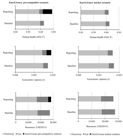 Figure 10 summarizes the endpoint environmental impacts of the energy consumed by houses during the baseline and reporting periods using the EnerGAware pre-competitive scenario (left) and the EnerGAware market solution (right), considering that the game was implemented in 50 houses for one year. The results revealed that the EnerGAware pre-competitive scenario, which emerged directly from the research project, added significant environmental impact to human health (29.04%), ecosystems (10.06%), and resources (3.59%) in relation to the baseline situation (Figure 10). However, when use of the game outside of the research project was analysed, the results showed that the environmental impact in the reporting period was lower than in the baseline period. Reductions ranged from 3.68% for damage to human health, 3.87% for ecosystem quality, and 4.81% for resource availability (Figure 10).