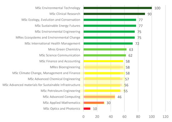 Forty (40) well-established master’s programmes related to environment and sustainability (35 offered by the UK and 5 by European universities) were evaluated using the methodology developed (Table 4). Each programme’s LOs were compared against the word codes related to each sustainability attribute and were then ranked using MCA as described earlier.