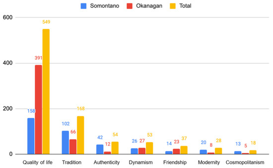 As far as tourist attractions are concerned, two main elements stand out: gastronomy and wine landscape. In the case of gastronomy, there is an evident alignment between the posted messages and the hedonistic or pleasant experience of consuming wine. Secondly, wine landscape is presented as a catalyst for the experiences lived and the territorial imaginary. Moreover, this tourist attraction appears in most cases linked to tradition as an emotional value. In the tweets posted to show the values of each of the wine territories we find that, in the case of Okanagan Valley, the environment and the landscape of wine are part of the experience of the winery itself, thus integrating itself into the territory. On the other hand, in the case of Somontano, it more usually refers to urban leisure and it moves the experience out of the winery to place it in a separate space, so that the natural environment becomes irrelevant, as shown in Figure 7.