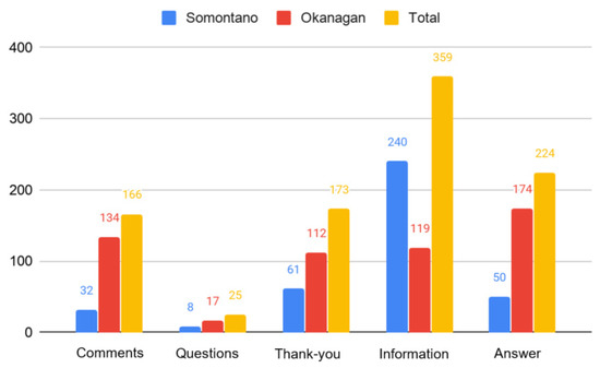 Wineries use Twitter to create a sentimental and experience-based link with their followers. Although it is not the most used social network, it does focus especially on creating engagement and not specifically on a commercial approach. Twitter is, as mentioned above, a social network that facilitates engagement and soft value. “The content of Twitter messages across all the different Twitter profiles frequently contained sentiment” [59]. Even though the most used social network is Facebook, used by 81.4% of the wineries (67.74% in Somontano and 83.7% in Okanagan), Twitter stands in second place, with 74.4% (54.8% in Somontano and 77.7% in Okanagan). Finally, 65.1% of the wineries use Instagram (45.2% in Somontano and 68.5% in Okanagan). There is a relevant difference in the use of social networks between one territory and the other, as well as in the number of posts of the five most active wineries, which in the case of Somontano ascend to 391 (plus 192 retweets) and in the case of Okanagan, to 557 (plus 238 retweets).