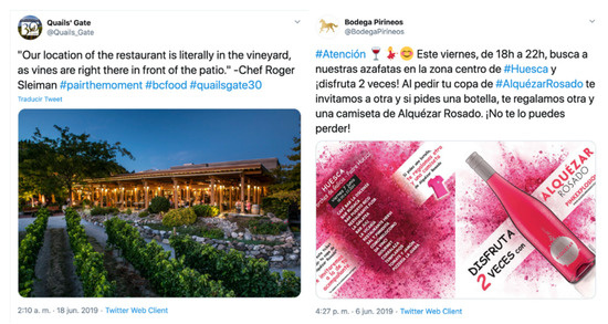 This research is based on the analysis of the tweets published by the five most active wineries on Twitter from each of the territories studied between 1 June and 31 October 2019. The period chosen coincides with the grape harvest of both territories. For this purpose, a content analysis sheet adapted from Huertas Roig [109] has been used in order to standardize the analysis of the messages. The terms related to tourist attractions and emotional values that appear in the tweets have been taken into account and, on the other hand, the type of written and audiovisual content have been classified differentiating the type of hypertext attached to the message.