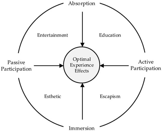 The most significant difference between tourism products and non-tourism products is whether consumers participate in the production process, which means that the production process of tourism products must be accompanied by a large number of tourists’ participation and experiences [67]. In the era of experience economy in which products and services no longer have the highest economic value, the most popular tourism products must be the one that can bring rich experience to tourists [68]. As the proponent of the experience economy concept, Pine and Gilmore [17] believed that experience occurs when the company intends to use services as a platform and commodities as props to attract consumers in a way that can create unforgettable memories in some specific events. Based on the theory of experience economy, Oh, Fiore, and Jeoung [69] argued that tourist’s participation level (active or passive) and participation form (absorption or immersion) could determine their distinct states of tourism experience (as shown in Figure 2): (1) From the perspective of their participation level when participation is more passive, tourists will get entertainment and esthetic experience, and when participation is more active, tourists will get education and escapism experience; from the perspective of participation form, tourists usually “absorb” entertainment and educational experience from tourism products, and immerse themselves in the aesthetic and escapism experience that tourism products bring to them. The “absorb” refers to attracting tourists’ attention by introducing experience into their minds, and the “immerse” means tourists themselves become part of the experience [70]. Relevant studies also showed that tourism experience would promote individuals’ strong and positive emotional responses, which is the reflection of individuals based on absorption and immersion experience [69,71,72]. Given this, entertainment experience, educational experience, aesthetic experience, and escapism experience are generally regarded as the four dimensions of tourism experience to explore the role and function of experience process between tourists and tourism activities [69,71,72,73].