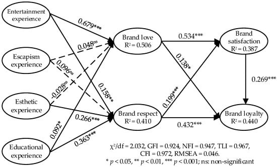Based on the validated measurement model, the structural model was estimated by the maximum likelihood approach and bias-corrected percentile method through bootstrap resamples (N = 10,000) in AMOS [92,94]. The fit indices of the structural model were tenable with χ2 = 473.572, df = 233, p < 0.05, χ2/df = 2.032 (<3), RMR = 0.032 (<0.05), GFI = 0.924 (>0.9), NFI = 0.947 (>0.9), TLI = 0.967 (>0.9), CFI = 0.972 (>0.9), RMSEA = 0.046 (<0.08) [84,98,99,100], indicating a good fitness between the collected sample and the proposed conceptual model. The structural model explained 50.6%, 41.0%, 38.7%, and 44.0% of the variance in brand love, brand respect, brand satisfaction, and brand loyalty, respectively.