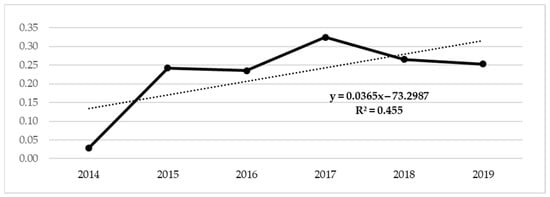 Trend line of the proportion of the environmental component occurrence in 2014–2019 with relation to students of the Tourism study programme.