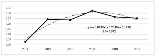 All of the parameters of both regression models are statistically significant (p-value for linear model is 0.142 and p-value for quadratic model is 0.042). The obtained linear model explains 45% variability of the dependent variable as a result of the variability of the independent variable, with the quadratic model accounting for as much as 87% of this variability. The mean occurrence value ranges around 22.5% of students from the total figure. The linear model slope y = 0.0365x − 73.2987 can be interpreted as an average year-on-year increase of 3.7% of the Tourism students participating in work placement containing environmental components. This model is illustrated in Figure 1. The observed values are represented by a connected line graph in bold, while the trend line slope is depicted by a dotted line. The quadratic model y = −0.0239 × 2 + 0.2038x − 0.1259 indicates that the original growing trend from 2014 ends in 2017, where it reached the highest point of the parabola. Subsequently, there was a decline, which however slowed down in 2019. This model is illustrated in Figure 2. The observed values are again represented by a connected line graph in bold, while the trend parabola slope is depicted by a dotted line. It should be noted that the data for 2019 are incomplete and that the six-year time series is too short to generalise these conclusions with a prediction. Admittedly, the parabola describes the observed values better; nonetheless, this trend may only be imaginary.