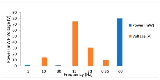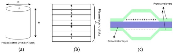 In addition to the materials’ properties, environmental properties, such as loading conditions and temperature, affect the output of piezoelectric harvesters. Their output becomes higher if the applied stresses are parallel to the polarisation direction. Loading frequency also significantly influences the output, and, regarding the temperature, the Curie point is the threshold temperature beyond which the material loses its piezoelectricity [,,,].