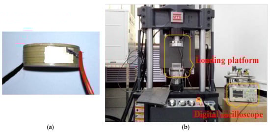 Roshani et al., in 2016, designed and tested piezoelectric disk harvesters and found that increasing the frequency and applied load has a positive effect on the harvester’s power output. A durability test on the harvesters showed a constant output in 8 h, and the feasibility study of the harvesters indicated that interstate highways with high traffic load are suitable alternatives for installing these harvesters []. Figure 5 shows the disk harvester embedded in the asphalt sample being tested.